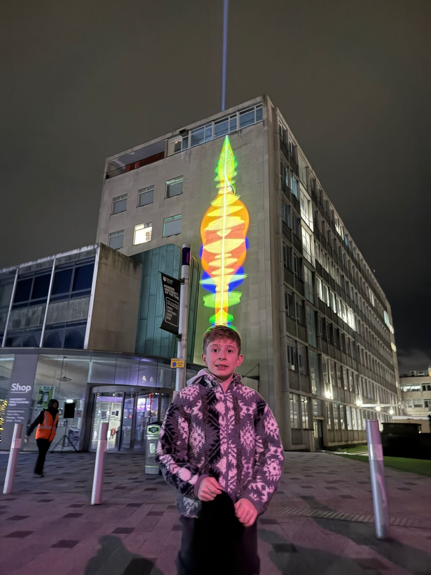 Enchanted City is a family-friendly, after-dark light and art adventure inspired by space, science, and the night sky. Think projections on buildings, glowing installations, roaming characters, and interactive artworks scattered across the campus rather than one fixed trail.